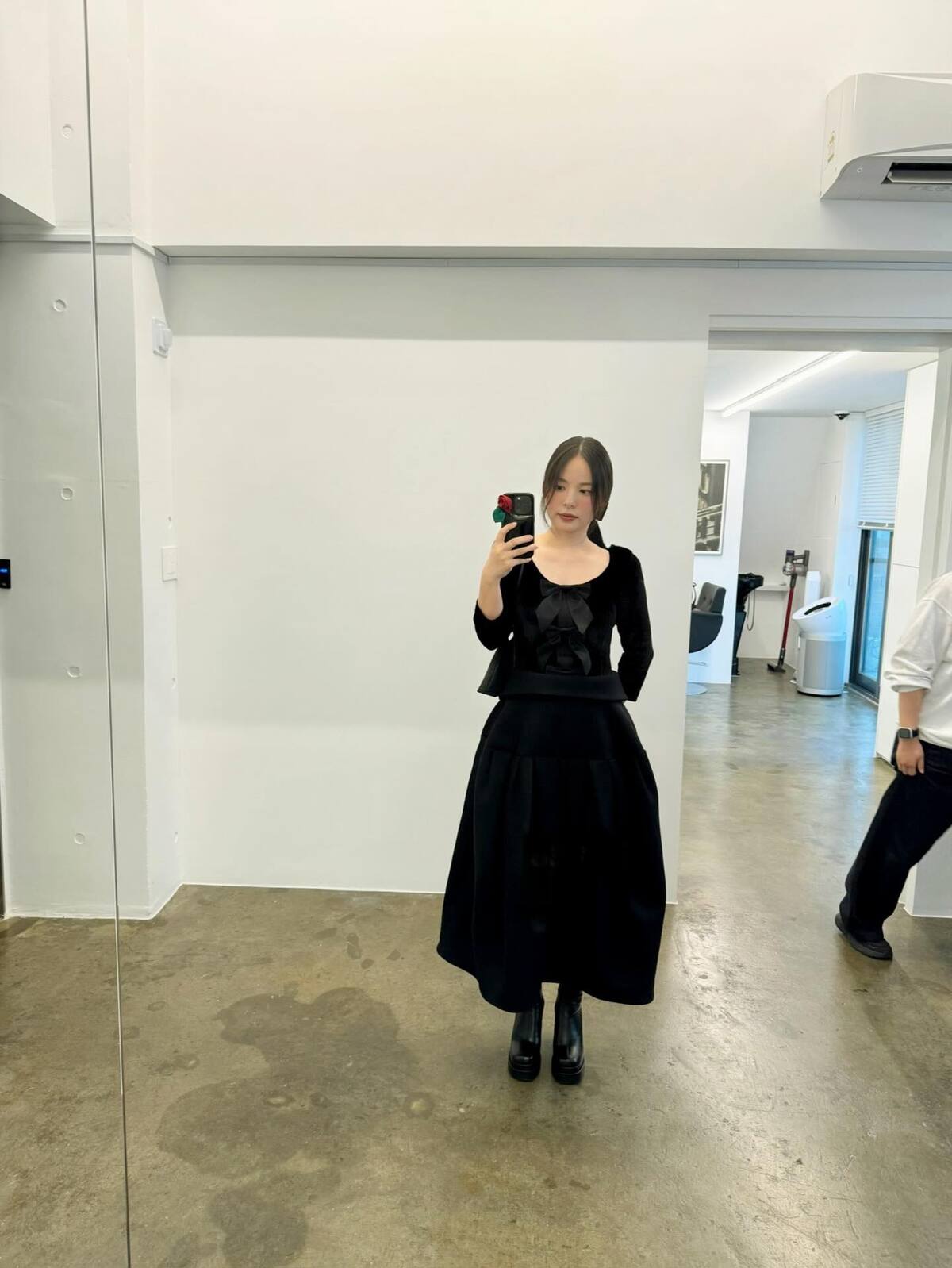 공개된 사진 속 민효린은 여리여리한 목선이 드러나는 라운드 넥의 리본이 포인트인 블랙 원피스를 착용한 채 거울 셀카를 찍고 있는 모습이었다. 앞머리를 내린 채 로우 포니테일 헤어스타일로 깔끔하면서도 세련된 분위기를 완성했다. 여기에 커다란 블랙 리본핀을 함께 착용해 포인트를 더했다.