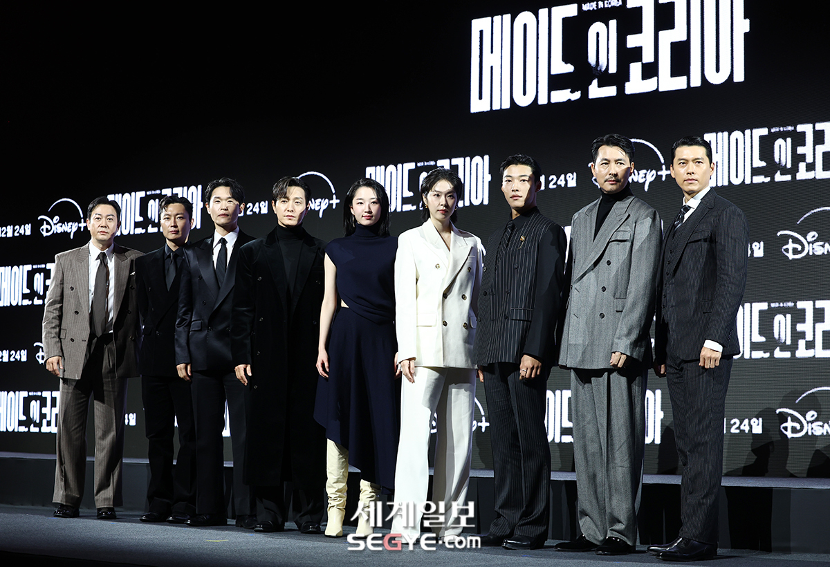 15일 서울 강남구 그랜드 인터컨티넨탈 서울 파르나스 호텔에서는 디즈니+ 오리지널 시리즈 드라마 '메이드 인 코리아'의 제작발표회가 진행됐다. 이날 현장에는 우민호 감독을 비롯해 배우 현빈, 정우성, 우도환, 서은수, 원지안, 정성일, 강길우, 노재원, 박용우가 참석했다.