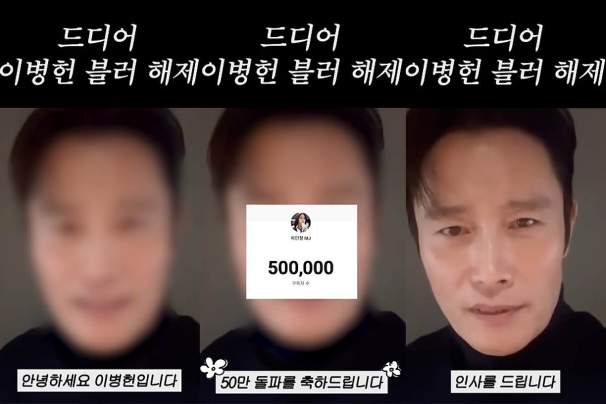 배우 이병헌이 아내 이민정의 유튜브 채널 구독자 50만 명 달성을 축하하며 마침내 맨얼굴을 공개했다.