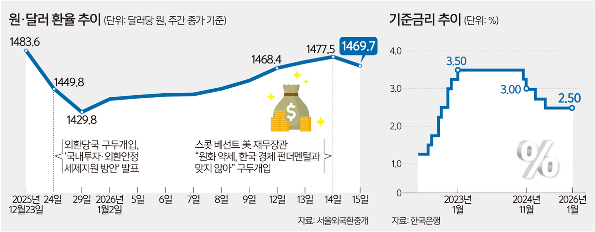 이번 금리 동결은 예견된 일이었다. 지난 연말 외환당국의 구두개입과 국민연금 환 헤지 등의 영향으로 1480원대에서 1420원대까지 떨어진 환율은 최근 다시 치솟아 1470원 선까지 왔다.