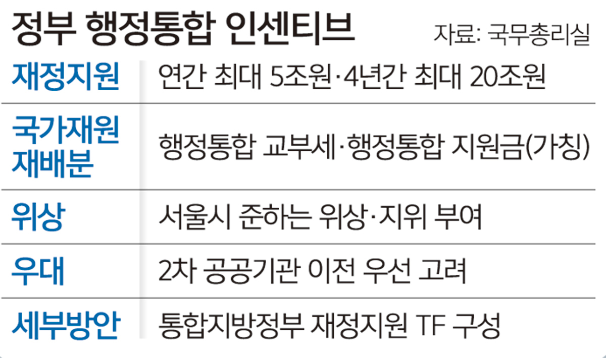 김민석 국무총리는 16일 광역 지방정부 간 행정통합시 부여하는 인센티브안을 내놓았다. 가장 눈길을 끈 대목은 파격적인 재정지원이다. 통합특별시에 연간 최대 5조원씩 4년간 최대 20조원 수준의 재정지원을 약속했다. 웬만한 자자체의 연간 예산에 버금가는 재정규모다. 여기에 행정통합 교부세와 행정통합 지원금을 신설해 국가 재원을 나눠주겠다는 재정분권도 시사했다.