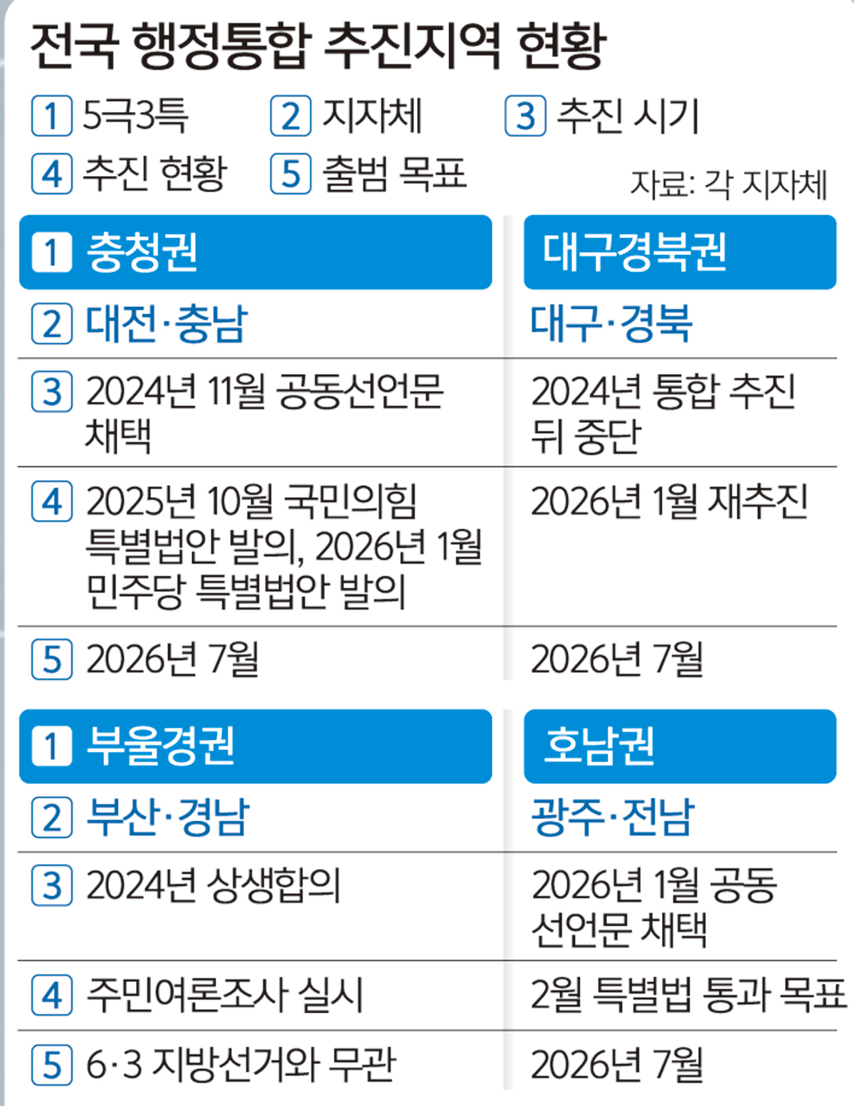 정부가 행정통합하는 광역자치단체에 이 같은 인센티브안을 내놓자 전국에 ‘통합특별시’ 바람이 불고 있다. 가장 뒤늦게 뛰어든 광주와 전남이 올 7월 전남·광주특별시 행정통합 출범을 목표로 속도전을 펼치고 있다. 전임 윤석열정부 당시 전국에서 가장 먼저 행정통합의 깃발을 올린 대구와 경북은 다시 통합 논의에 불을 붙이고 있다. 대전·충남 역시 정부의 잇단 ‘당근’에 통합 가속 페달을 밟고 있다. 반면 부산·울산·경남 ‘메가시티’ 논의를 주도했던 부산과 경남은 6·3 지방선거 전 통합하지는 않겠다는 분위기다. 중앙정부의 재정지원 등 실질적 성과 대신 지속가능한 행정체제 개편 같은 내실을 다지겠다는 의지가 엿보인다.