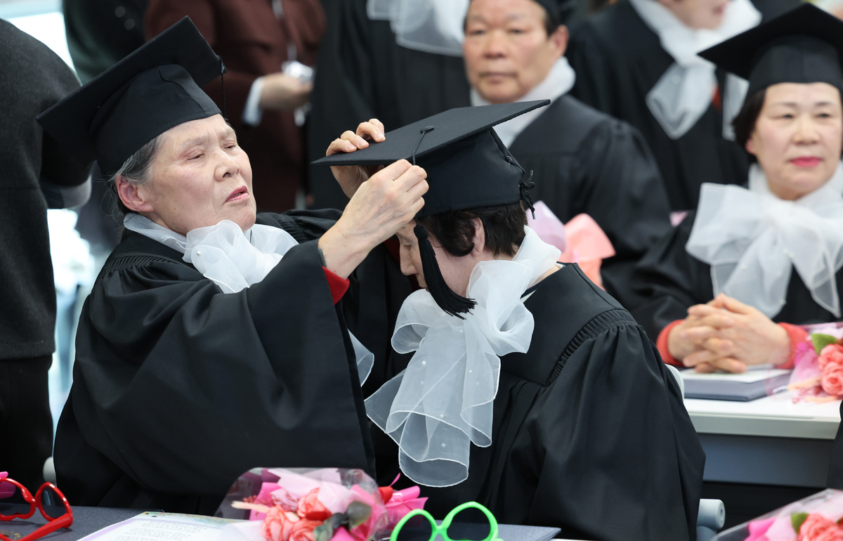 28일 서울 영등포구 영등포구청 별관에서 열린 2025학년도 영등포늘푸름학교 졸업식에서 졸업가운을 입은 어르신들이 학사모를 만져주고 있다. 늘푸름학교는 초등 중학 학력을 인정받는 성인문해학교다.