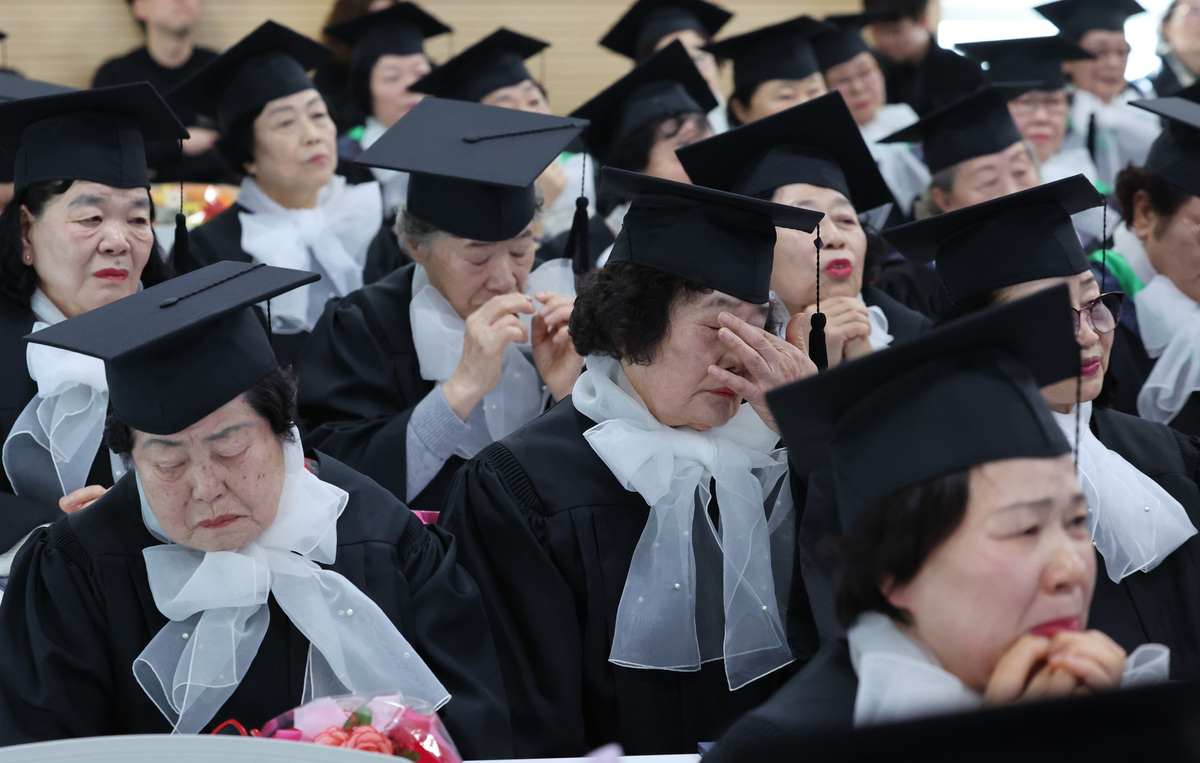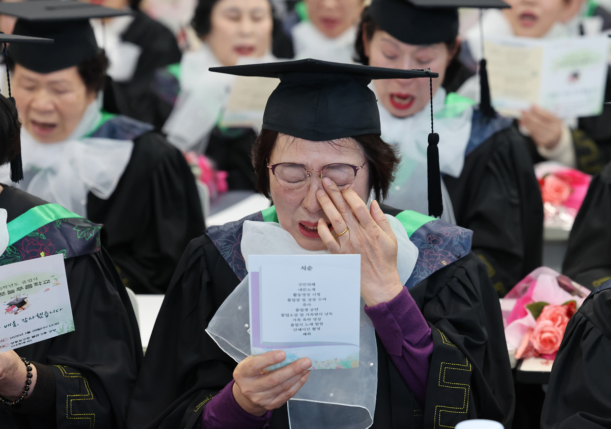 28일 서울 영등포구 영등포구청 별관에서 열린 2025학년도 영등포늘푸름학교 졸업식에서 졸업가운과 학사모를 착용한 어르신들이 눈물을 흘리고 있다. 늘푸름학교는 초등 중학 학력을 인정받는 성인문해학교다.