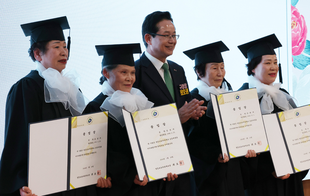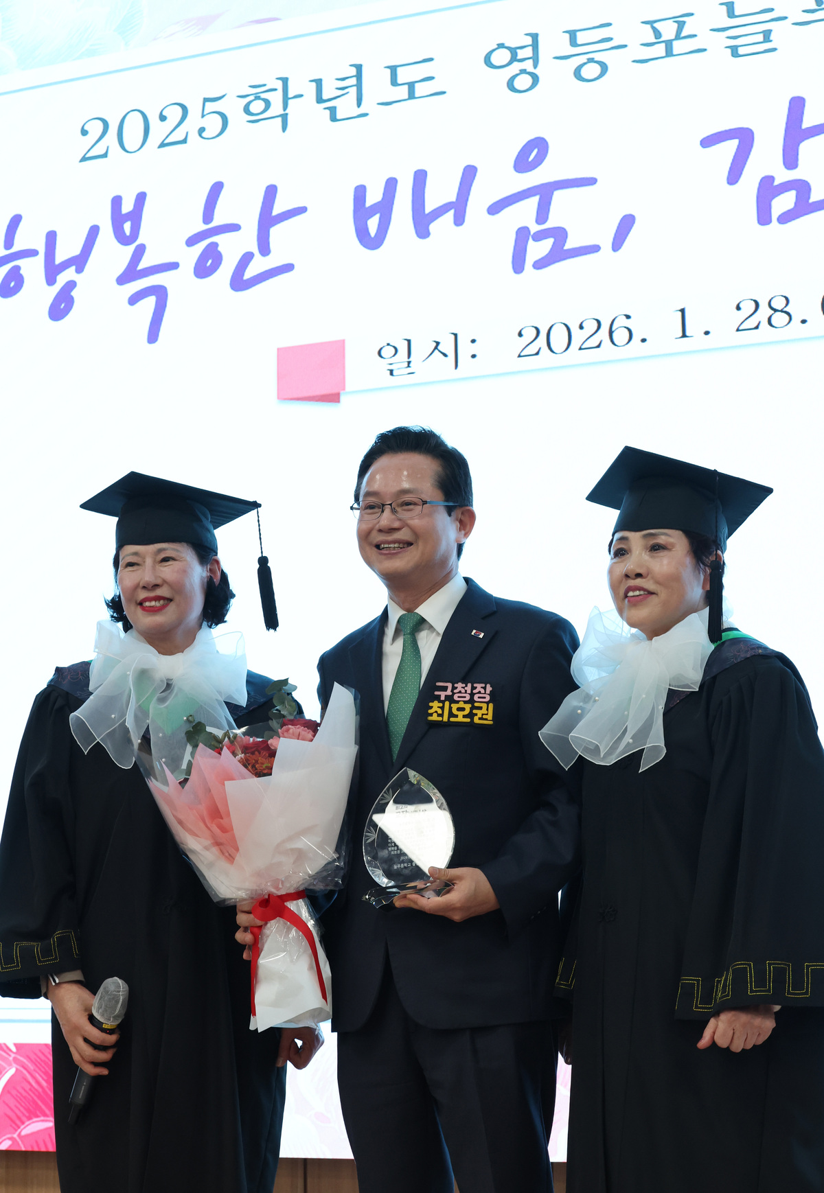28일 서울 영등포구 영등포구청 별관에서 열린 2025학년도 영등포늘푸름학교 졸업식에서 졸업가운과 학사모를 착용한 어르신들이 최호권 영등포구청장과 함께 기념촬영하고 있다. 늘푸름학교는 초등 중학 학력을 인정받는 성인문해학교다.
