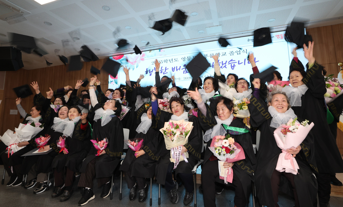28일 서울 영등포구 영등포구청 별관에서 열린 2025학년도 영등포늘푸름학교 졸업식에서 졸업가운과 학사모를 착용한 어르신들이 학사모를 던지고 있다. 늘푸름학교는 초등 중학 학력을 인정받는 성인문해학교다.