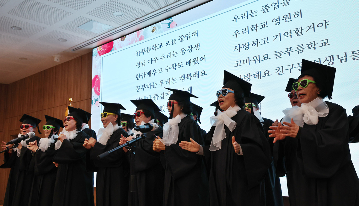 28일 서울 영등포구 영등포구청 별관에서 열린 2025학년도 영등포늘푸름학교 졸업식에서 졸업가운과 학사모를 착용한 어르신들이 합창을 하고 있다. 늘푸름학교는 초등 중학 학력을 인정받는 성인문해학교다.