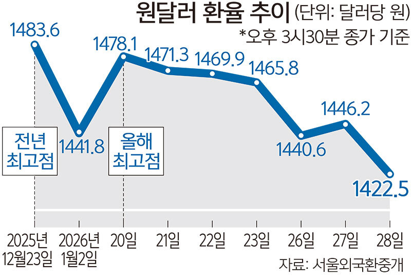 이날 서울 외환시장에서 미국 달러화 대비 원화 환율은 전 거래일보다 23.7원 급락한 1422.5원(오후 3시30분 기준)에 거래를 마쳤다. 이날 환율은 전날보다 15.2원 낮은 1431.0원으로 출발해 1430원대 초반을 오가다 내림폭을 키웠다. 이날 주간 거래 종가는 지난해 10월20일(1419.2원) 이후 석 달 만에 가장 낮은 수준이다.