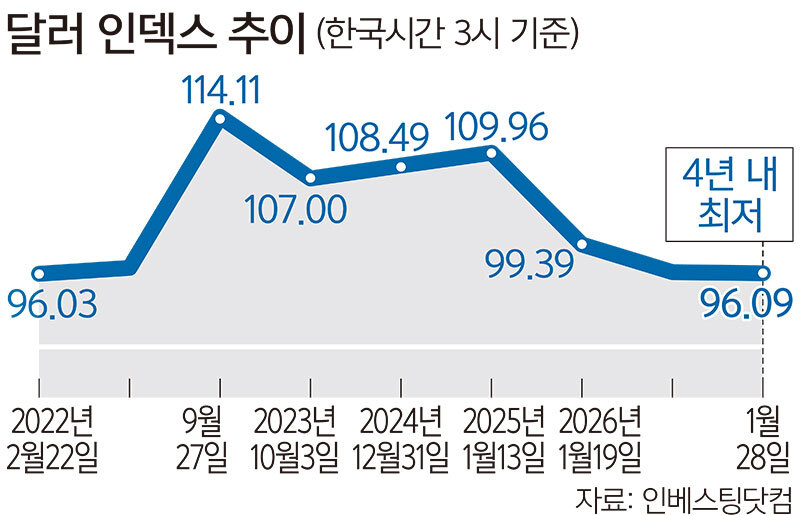 달러화 가치도 4년 만에 최저 수준으로 떨어졌다. 이날 ICE 선물거래소에서 주요 6개 통화에 대한 달러화의 가치를 반영한 달러 인덱스는 96.05(오후 3시30분 기준)로 2022년 2월 이후 최저 수준을 기록했다.