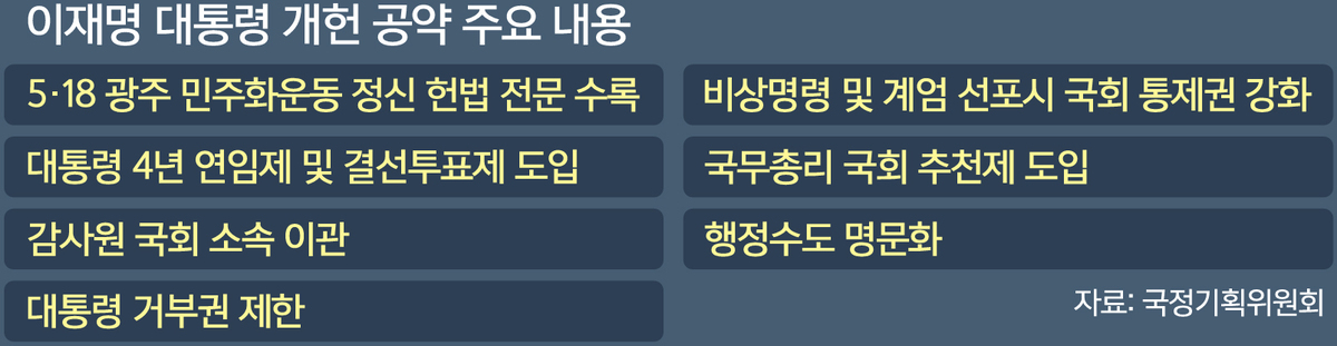 이재명정부에서도 권력구조 개편과 관련된 논의는 진척이 없는 상황이다. 국회 차원의 개헌특별위원회 구성도 아직 이뤄지지 않았다. 대선 과정에서부터 개헌을 제안했던 우원식 국회의장은 개헌 논의를 더는 미룰 수 없다며 17일까지 개헌특위를 구성하자고 여야에 촉구했다. 개헌특위가 구성되더라도 여야는 권력구조 개편을 제외한 의제들만 우선 처리하는 ‘단계적 개헌’을 논의할 전망이다.