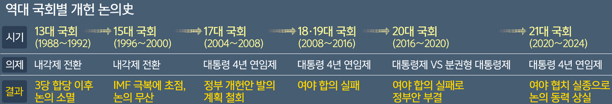 1987년 민주화로 87년 체제가 들어선 이후 개헌 논의는 끊이지 않아 왔다. 대통령 5년 단임제를 의원내각제, 대통령 4년 중임제, 분권형 대통령제 등으로 전환하는 권력구조 개편이 논의의 화두였지만 개헌안은 국민투표는커녕 국회 문턱조차 넘지 못했다. 대통령과 여야 대선주자들이 각자의 정치적 득실을 우선시한 탓에 결국 합의에 이르지 못한 경우가 대다수였다.