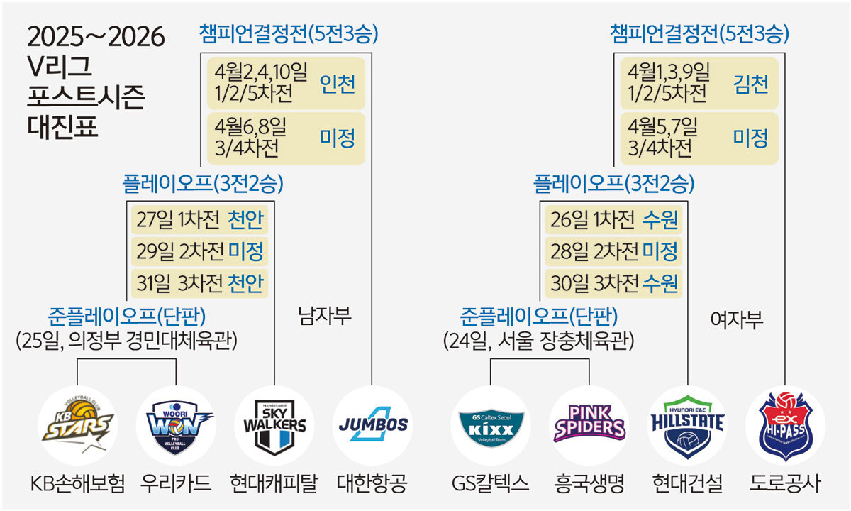 역대급 순위경쟁을 이어간 2025~2026 프로배구 V리그의 포스트시즌 대진이 정규리그 일정 종료 하루 전날인 18일 완성됐다. 올 시즌 정규리그는 19일 남자부 1, 2위를 확정한 대한항공과 현대캐피탈의 맞대결을 끝으로 막 내렸다. 이 일정이 국제배구연맹(FIVB)의 클럽 시즌 일정으로 인해 당초 지난해 10월18일 시즌 개막전이 뒤로 밀린 것을 감안하면 사실상 봄 배구를 향한 경쟁이 시즌 끝까지 이어진 것이나 다름없다.